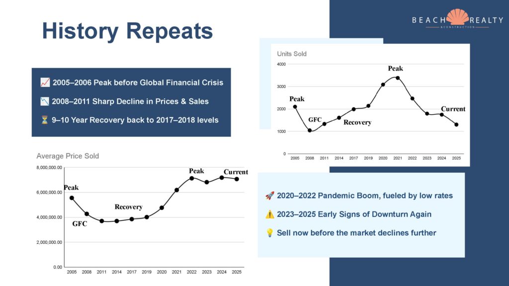In 2005 and 2006, we hit a major peak before the 2008 financial crisis struck. From 2008 through 2011, prices and sales activity fell sharply — and it took nearly a full decade to recover. Then came another boom from 2020 to 2022, fueled by record-low interest rates and intense buyer demand. Now, as we move through 2023–2025, we’re beginning to see familiar signs: softening demand, rising inventory, and leveling prices.